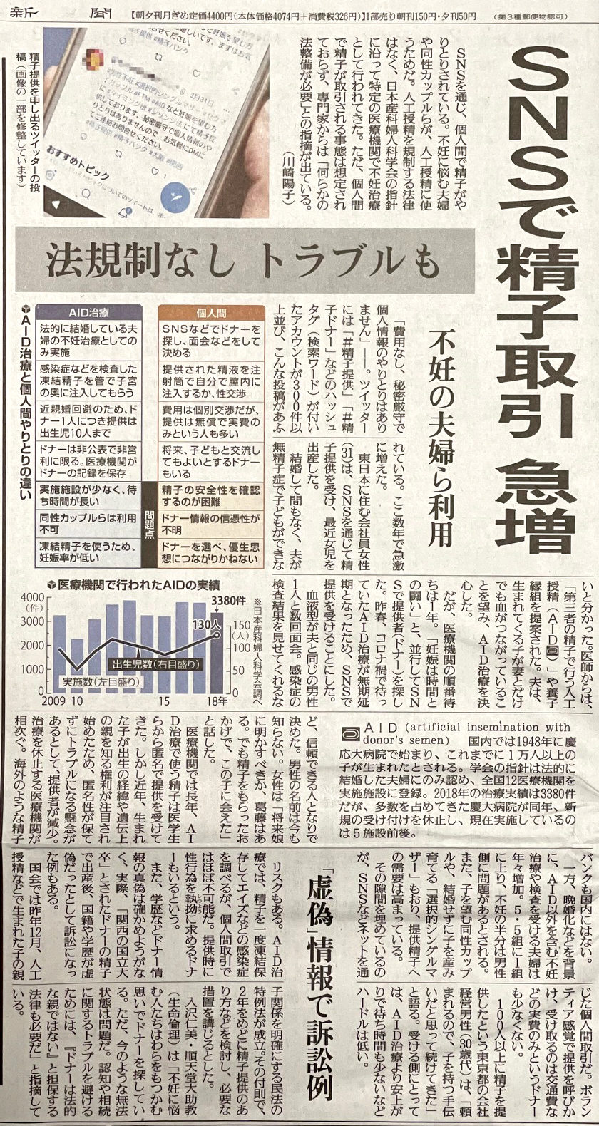 (出典)SNSで精子取引 急増, 法規制なし トラブルも, 不妊の夫婦ら利用, 読売新聞. 2021-04-16, 日刊, p.33.